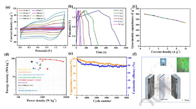 圖5 SSC的電化學(xué)性能。(一)CV曲線。(b)GCD圖。(c)特定的電容。(d) Ragone圖。(e)循環(huán)性能和庫侖效率(在電流密度為5 a g