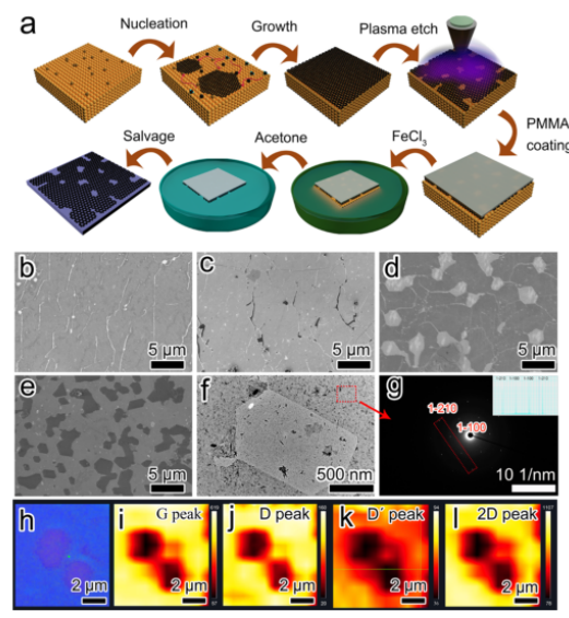 圖 1. (a) 缺陷石墨烯/SiO2/Si的制備示意圖。 原始石墨烯在(b)銅箔上生長(zhǎng)和(c)轉(zhuǎn)移到 SiO2/Si 基板上的SEM圖像。生長(zhǎng)在(d) 銅箔上和 (e) 轉(zhuǎn)移到 SiO