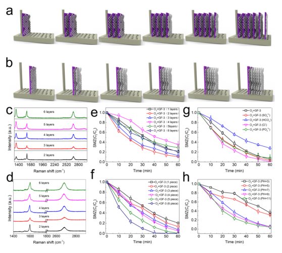 圖 6. 多片 (a) 和多層 (b) 缺陷石墨烯薄膜的示意圖。 (c)多層缺陷石墨烯的拉曼光譜。 (d) 是(c)中G峰和2D峰的放大。(e)用多層缺陷石墨烯和 (f)多片缺陷石墨烯通過(guò)催化臭氧化去除 SMZ。 (g) 存在各種陰離子時(shí)的 SMZ 氧化效率。 (h) SMZ降解率與溶液pH 值之間的關(guān)系。