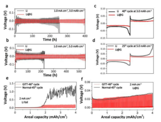 Figure 3.(a,b) 在不同剝離/電鍍?nèi)萘肯碌暮汶娏餮h(huán)性能。(c,d)對稱電池的容量-電壓曲線。(e,f) 使用不同電極的對稱電池的電壓情況。