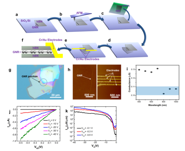 圖 3. h-BN封裝GNR和電氣特性。 (a-f) GNR的h-BN封裝和端鍵合接觸制造工藝的示意圖。 (g) 多層hBN-GNR-hBN 異質(zhì)結(jié)構(gòu)的光學圖像。 虛線圓圈表示GNR的位置。 (h)所選GNR(左)和帶有四個電極的制造裝置(右)的AFM圖像。 (i)測量GNR的電導率作為光激發(fā)波長的函數(shù),標準導數(shù)作為誤差線。藍色區(qū)域表示低于電導率的最高測量暗值的值。(j) 在從0到-40 V 的各種柵極電壓VG下以-10 V的步長在黑暗中記錄的輸出特性。 (k)在各種源漏電壓 V