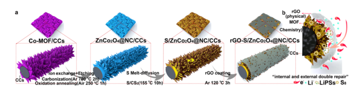 圖 1. (a) rGO-S/ZnCo2O4@NC/CCs 合成示意圖。(b) rGO“涂層”抑制“穿梭效應(yīng)”的硫儲存電化學(xué)機(jī)制。