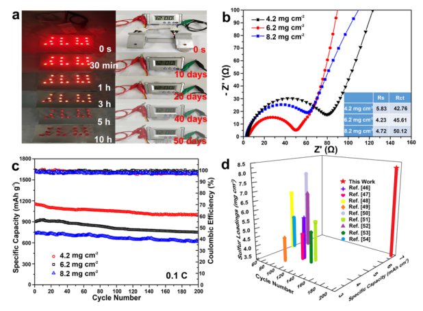 -2)。 (a) 單節(jié)電池觸發(fā)LED和電子表的照片。 (b) 奈奎斯特圖。 (c) 在0.1 C時的循環(huán)穩(wěn)定性。 (d) 這項工作的比容量、負(fù)載和循環(huán)性能與文獻(xiàn)中最近的相關(guān)報告的相關(guān)性。