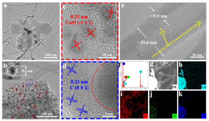 圖4. (a)TEM圖像;(b−e) HR-TEM圖像;(f) EDS頻譜;NCNT/CuO/C的(g−k)元素映射。