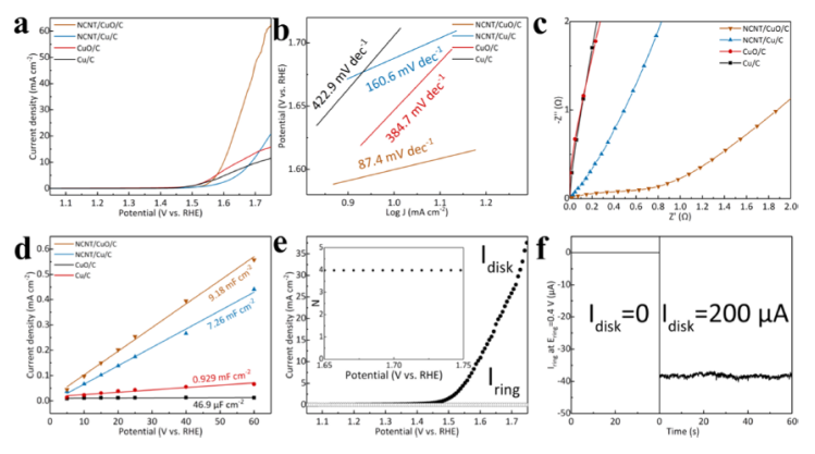2飽和的1.0M KOH的RRDE伏安曲線及其電子轉(zhuǎn)移數(shù);(f) NCNT/CuO/C的i-t曲線。