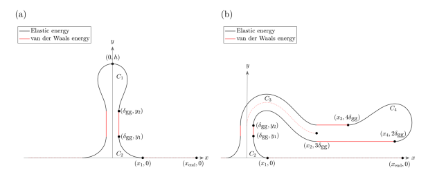 通過化學(xué)氣相沉積法生長的石墨烯中,通常可以觀察到各種構(gòu)型,包括波紋和褶皺。站立的自粘石墨烯褶皺在達(dá)到一定高度后會折疊為石墨烯折皺。我們采用連續(xù)近似法來預(yù)測由不同金屬基底支撐的石墨烯折皺的形態(tài)。我們的模型基于彈性彎曲和范德華(vdW)相互作用能量的平衡。我們將褶皺的幾何形狀劃分為三個組成部分,并將系統(tǒng)的總能量表示為這三個獨(dú)立的能量成分的總和。利用變分法將每個能量分量最小化,并推導(dǎo)出對應(yīng)部分形狀的參數(shù)解。我們應(yīng)用6-12 Lennard-Jones勢來模擬石墨烯-基底vdW相互作用的強(qiáng)度。當(dāng)我們考慮折皺的兩種潛在構(gòu)象時,分析顯示,折疊的雙分子層后面總是跟著一個平坦區(qū)域。該模型還預(yù)測了自粘褶皺的臨界高度,結(jié)果與之前的實(shí)驗(yàn)和理論數(shù)據(jù)一致。該模型還預(yù)測了自粘褶皺的臨界高度,提供了與先前關(guān)于該過渡高度的實(shí)驗(yàn)和理論數(shù)據(jù)一致的結(jié)果。