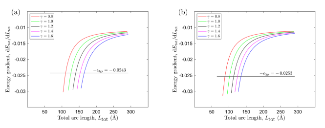 tot的函數(shù)。彩色線表示構(gòu)象A的能量梯度,黑線表示構(gòu)象B的能量梯度,其中交點(diǎn)給出了構(gòu)象A每個γ值的長度L