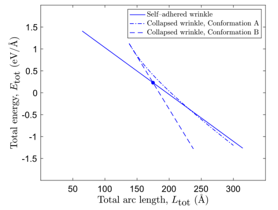 圖4.對于Cu(111)基底支撐的彎曲剛度為γ=1.2 eV的不同褶皺結(jié)構(gòu),總能量E
