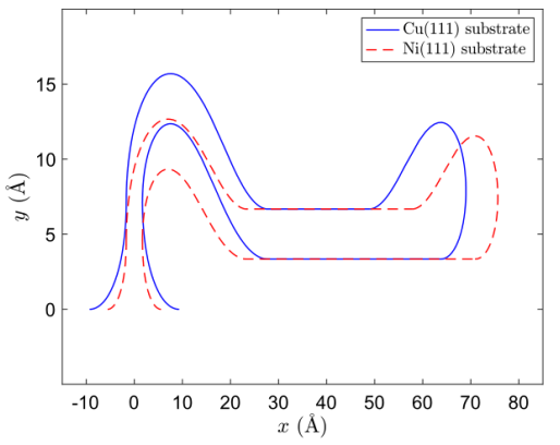 圖3.能量梯度是由(a)Cu(111)基底和(b) Ni(111)基底支撐的折皺的總弧長L