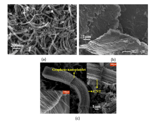 圖10. (a)MWCNTs,(b)GNPs和(c)MWCNT-GNP雜化物的SEM顯微照片。