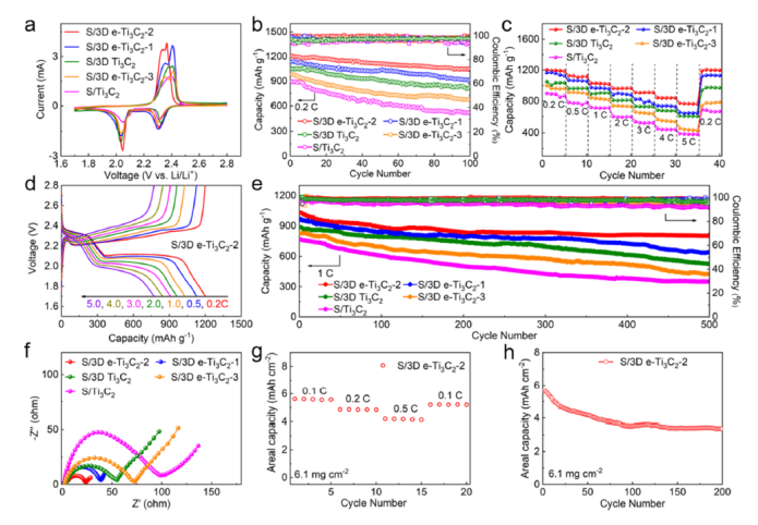 -1時的CV曲線。(b) 0.2 C時不同電極的循環性能(c)速率性能。(d) S/3D e-Ti
