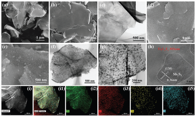 3復合材料的HRTEM圖像和i)含有重疊、Ti、C、Sb和S (i1 i5)元素映射圖像的HADDF圖像。