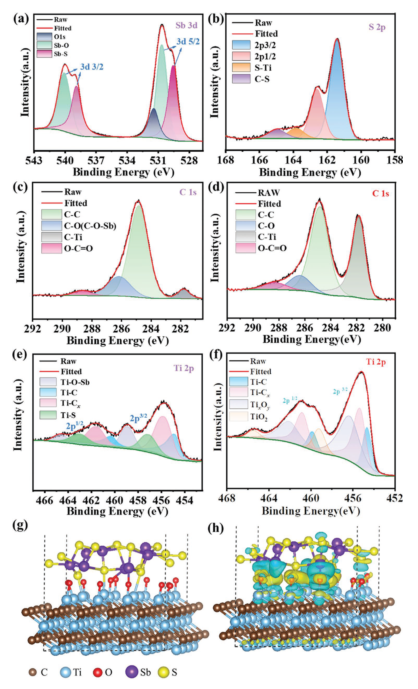 圖4。(a) Sb 3d, (b) S2p, (c,d) c 1s, (e,f) Ti
