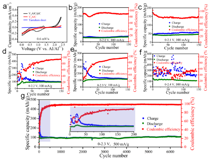 2AlC在鋁電池中的循環(huán)性能(0.01-2.3 V)。(g) E-V