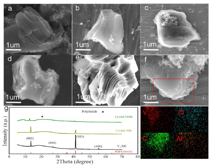 2AlC循環(huán)150次后的SEM圖像。(f) V