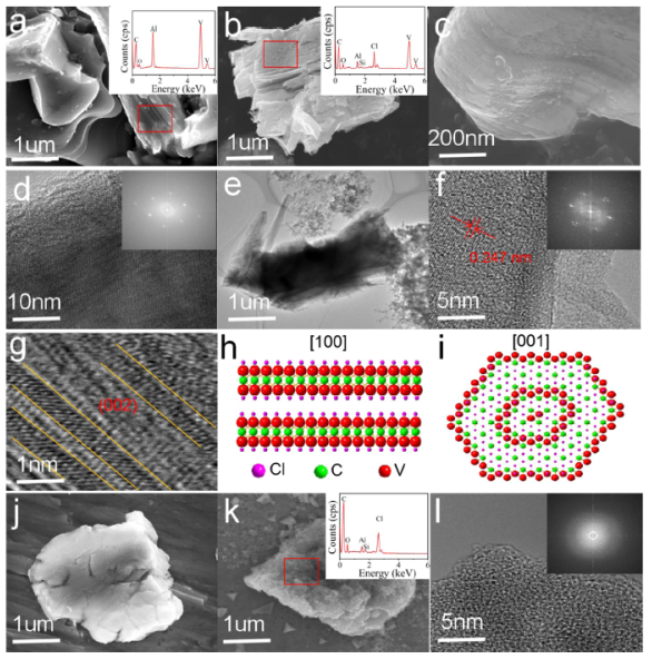 2AlC 2500次后,和插圖顯示了所選區(qū)域的EDS譜(電壓窗口是0.01 - 2.4 V) (l)的高分辨率透射電鏡圖像E-V