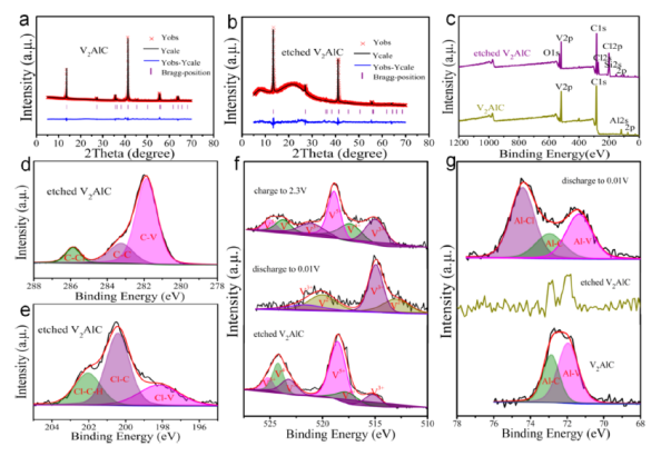 2AlC在不同電壓下的高分辨率V - 2p XPS譜。(g) V