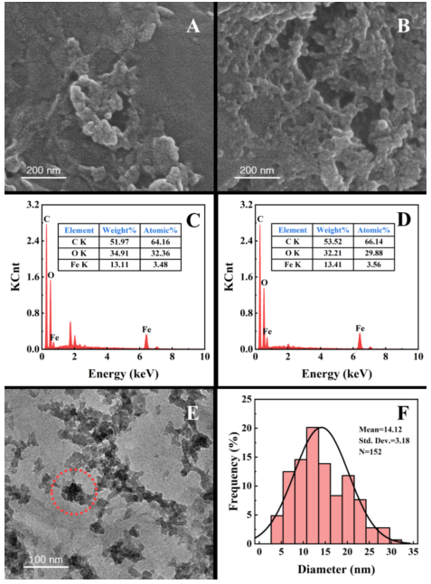 圖3 GO@Fe NPs(A)和γCD-GO@Fe NPs(B)的SEM圖像,以及GO@Fe NPs(C)和γCD-GO@Fe NPs(D)的EDS譜圖;γCD-GO@Fe NPs (E)的TEM圖像和γ CD-GO @Fe NPs (F)的粒徑分布直方圖。