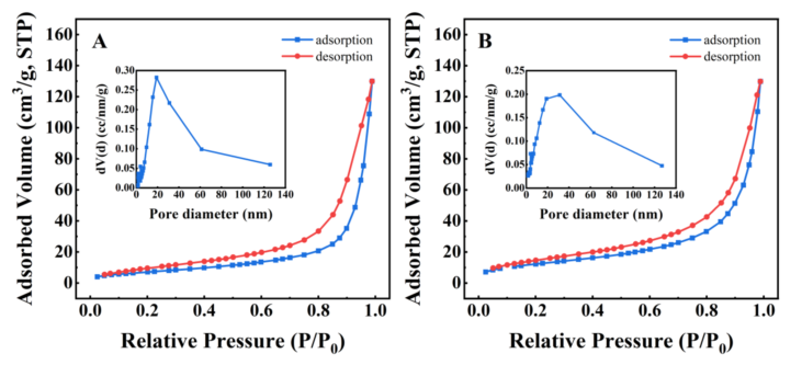 圖6所示 GO@Fe NPs (A)和γCDGO@ Fe NPs (B)的氮吸附-解吸等溫線及其相應的孔徑分布。
