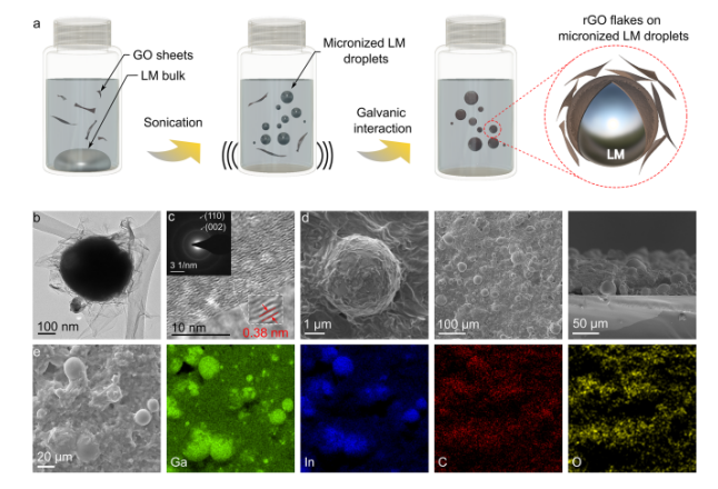 Figure 3.LM微滴對GO薄片的影響:(a)LM-rGO復(fù)合材料的合成示意圖。(b) LM-rGO核殼結(jié)構(gòu)的TEM圖像。(c) SAED分析和HR-TEM圖像, 揭示了沉積在LM核上rGO殼的層間間距。(d)LM-rGO在不同放大倍數(shù)和角度下的SEM圖像。(e) Ga, In, C, 和 O元素的能譜圖。