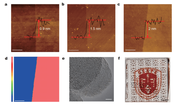 圖1.玻璃態石墨烯的材料表征結果和器件陣列圖片。在通道邊緣獲得的(a) 0.9-nm, (b) 1.5-nm和(c) 2-nm玻璃態石墨烯薄膜表面形態的AFM圖像。比例尺為1µm。插圖是與薄膜厚度相對應的高度輪廓。 (d)2-nm玻璃態石墨烯的CS-AFM圖像,在與圖(c)相同的區域進行掃描,并根據空間電流圖確定。比例尺為1µm,顏色條表示電流從藍色增加到粉紅色。(e)幾層玻璃態石墨烯的HR-TEM圖像。比例尺為5納米。(f)石英上0.9-nm玻璃態石墨烯器件陣列的數碼照片,顯示出良好的透明度。比例尺為2 mm。