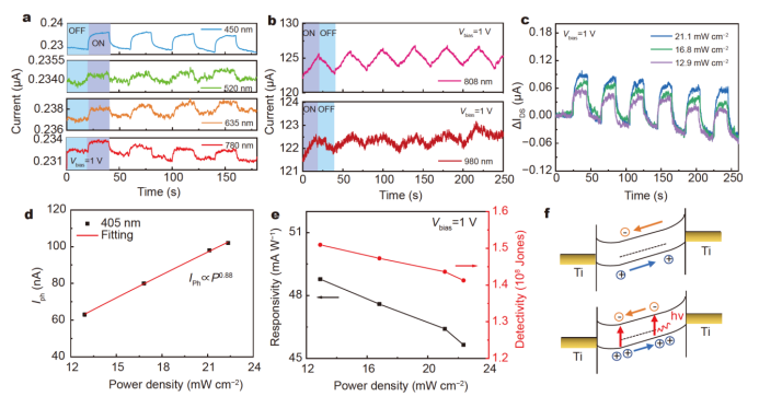 圖3.可見光-近紅外附加照明下的光響應特性、功率依賴光響應性能和玻璃態石墨烯光電探測器的能帶結構。(a)玻璃態石墨烯光電探測器(1.5 nm)分別在450、520、635和780 nm光照下的周期性瞬態光響應。施加的恒定電壓為1V。(b)另一組1.5 nm玻璃態石墨烯光電探測器在808和980 nm激光照射下的光響應動力學。施加的恒定電壓為1V。(c) 在1 V偏置電壓、405 nm激光照明、不同照明功率密度下,玻璃態石墨烯光電探測器(5.4 nm)的功率依賴性瞬態光響應。(d)由功率函數擬合的光電流與功率密度。(e)響應度和探測率與功率密度的關系。(f)玻璃態石墨烯光電探測器在偏置電壓下(上圖)和光照下(下圖)的能帶結構。