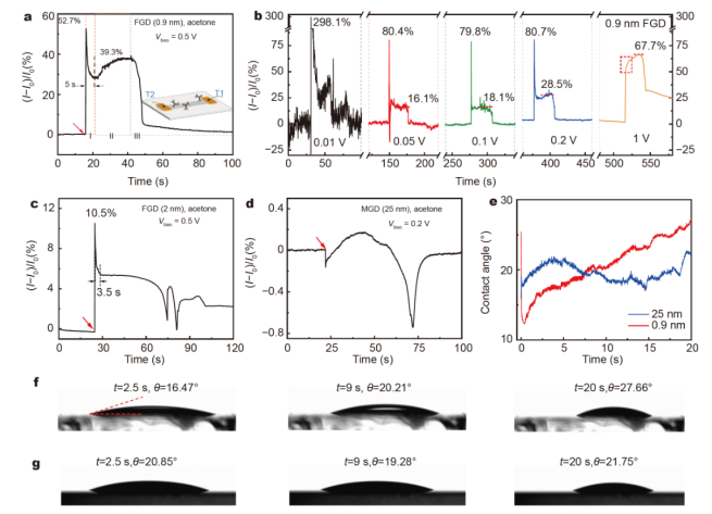 bias時,0.9-nm FGD的動態檢測響應。(a)中的插圖顯示了用于傳感的玻璃態石墨烯器件結構示意圖。(c) 2-nm FGD和(d) 25-nm MGD的動態檢測響應。(e) 30µL丙酮分別在0.9 nm和25 nm玻璃態石墨烯/石英表面的接觸角隨時間的變化。(f) 0.9-nm和(g) 25-nm玻璃態石墨烯在石英上丙酮接觸角的延時圖像序列。(a)、(c)和(d)中的紅色箭頭表示通道與丙酮液滴接觸的時間點。