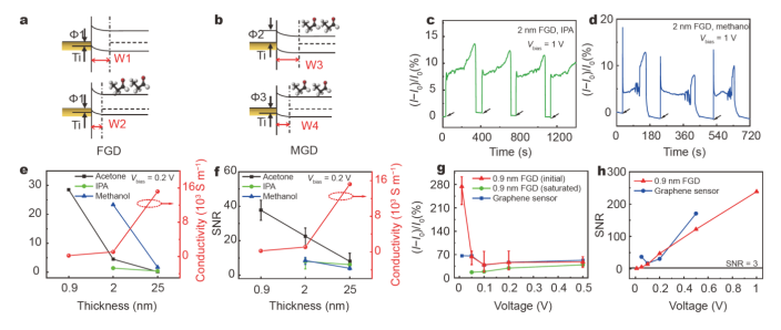 圖5. 能帶結構和傳感性能比較結果。(a)FGD和(b)MGD的對齊能帶結構示意圖。分子模型表示丙酮分子。黑色、白色和紅色的球分別代表碳原子、氫原子和氧原子。感測(c)IPA和(d)甲醇時2-nm FGD的動態檢測響應。箭頭表示玻璃態石墨烯通道與分析物接觸的時間。器件檢測不同VOC液體時(e)電流變化率和(f)信噪比(SNR)隨厚度的變化趨勢及其電導率。(g)FGD和石墨烯器件之間的電流變化率比較。(h) FGD和石墨烯器件之間的壓敏SNR比較。所需的最低SNR為3。