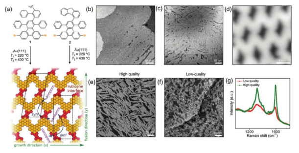 Figure 1. C-NPG的生長和結構鑒定。a) 自下而上合成C-NPG的示意圖。(b-d)低倍和高倍下的掃描隧道顯微鏡(STM,HR-STM)圖像。e-f) 高質量 (V = -1.8 V; I = 20 pA) 和 f) 低質量(V = −2 V; I = 20 pA)的兩種不同低覆蓋率單層 C-NPG 薄膜的 STM 圖像。g) 對應于圖 (e) 和 (f) 中所示樣品的拉曼光譜。