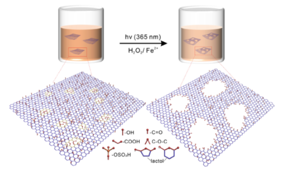 通過濕化學方法特定尺寸可控的刻蝕石墨烯基面仍然存在挑戰。這里,提出了一種簡便且可控的方法,制備了可溶液加工的多孔石墨烯衍生物。氧化石墨烯的衍生物,即氧官能化的石墨烯(oxo-G)被選作為前驅體,它具有可控的面內空位缺陷密度。隨后會產生羥基自由基,在oxo-G 基面內刻蝕孔,且優先從缺陷處開始刻蝕。因此,獲得的oxo-G可溶液加工薄片具有毫米橫向尺寸,和可調控的孔隙直徑( 在5 nm ~ 500 nm 之間)。此外,通過AFM、TEM、UV-vis 光譜、FTIR 光譜、XPS、固體NMR光譜和Raman光譜分析,提出了孔結構生長機制。羥基自由基與靠近缺陷位點的oxo-G之間的親電加成和氧化反應是蝕刻過程的基礎。該多孔石墨烯材料可用作膜材料或可調諧的二維材料。