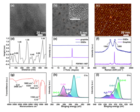 Figure 2. GQD的TEM(a、b)和 HRTEM(插圖)圖像。云母襯底上GQD的 AFM 圖像 (c) 和相應的高度分布情況 A-B (d)。 (e)原始石墨和 GQD的XRD 圖案。(f)原始石墨和 GQD的拉曼光譜。(g) GQDs的FTIR光譜。 高分辨率C1s (h) 和 O1s (i) XPS光譜。