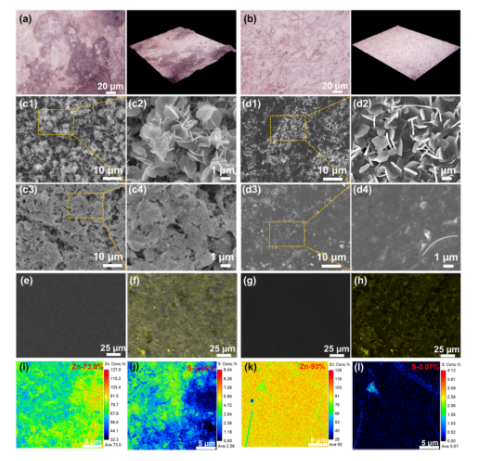 Figure 4. (a-b) 有/無GQDs時鋅陽極在10次循環后的光學顯微鏡照片。在10 mA cm-2電流密度下電鍍30分鐘后,(c1-c4)有/無GQDs的情況下,鋅陽極的SEM圖像。(d1-d4) 有/無GQDs時,Zn箔在循環20次后的 SEM 圖像。(e-h)有/無GQDs時,Zn 沉積層的共焦發光圖像。在普通電解質 (i, j) 和包含GQDs 電解液(k, l)中Zn 箔電極在循環20次后的 EPMA 映射圖像。