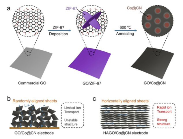Figure 1. (a)GO/Co@CN納米片的合成工藝示意圖,(b)隨機排列GO/Co@CN納米片的對照電極,(c)水平排列GO/Co@CN納米片的電極示意圖。