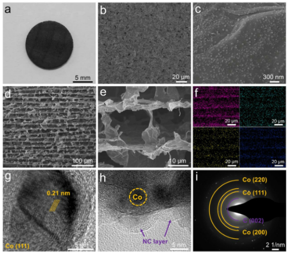 Figure 2. (a) HAGO/Co@CN電極的數碼照片。(b-c)SEM圖像。(d-f) HAGO/Co@CN電極的橫截面SEM圖像及相應的元素分布。(g-i)高分辨率透射電鏡圖像及相應的SAED模式。