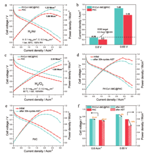 Figure 5. (a)在H2-空氣條件下,膜電極組件的穩(wěn)態(tài)極化曲線;(b)0.8和0.65 V時(shí)的電流密度;(c) H2-O2燃料電池的性能比較;(d) Pt1Co1IMC@Pt/C和(e)商用Pt/C的H2-空氣燃料電池在AST前后的極化曲線;(f)AST試驗(yàn)后的電壓降和功率密度損失。
