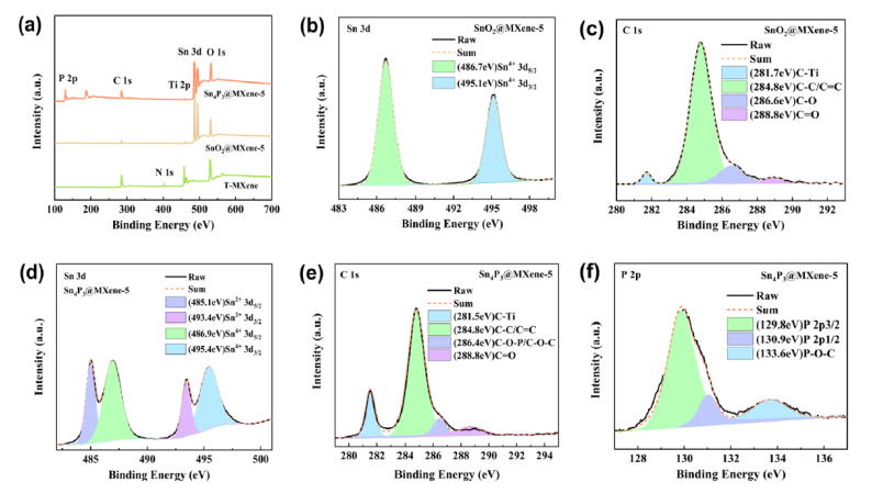 3@MXene-5的Sn 3d (d)、C 1s (e)和P 2p (f)的高分辨率光譜。