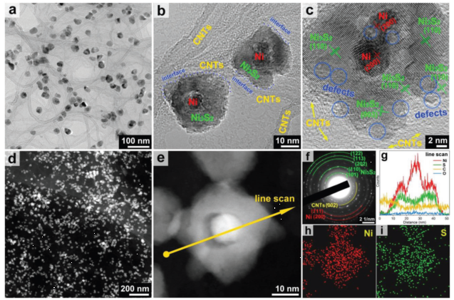 2/CNTs納米異質結構的a,b) TEM, c) HRTEM, d,e) HAADF-STEM圖像;f) SAED模式;g) EDS元素線掃描,h,i) EDS元素映射圖像。