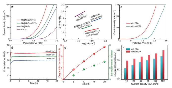 2/CNTs)的LSV曲線比較;d)固定電流密度下乙醇胺電氧化CP曲線;E)去除乙醇胺的量與反應時間和計算出的電子轉移數相關;f)當陰極HER與添加或不添加乙醇胺的陽極反應結合時,產生相同量的H