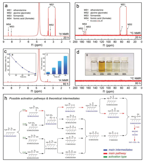 13C NMR譜;e)乙醇胺降解率(%)和f) TOC去除率(%)與反應時間的函數關系;G)電氧化0、20、40、60和80 h后陽極電解質的照片;H)乙醇胺氧化的機理。