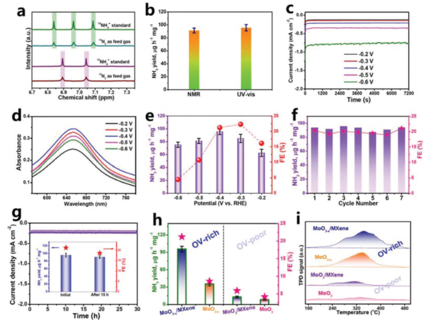 3-x/MXene在不同電位下的時安培曲線和相應的紫外可見吸收光譜,e)獲得NH