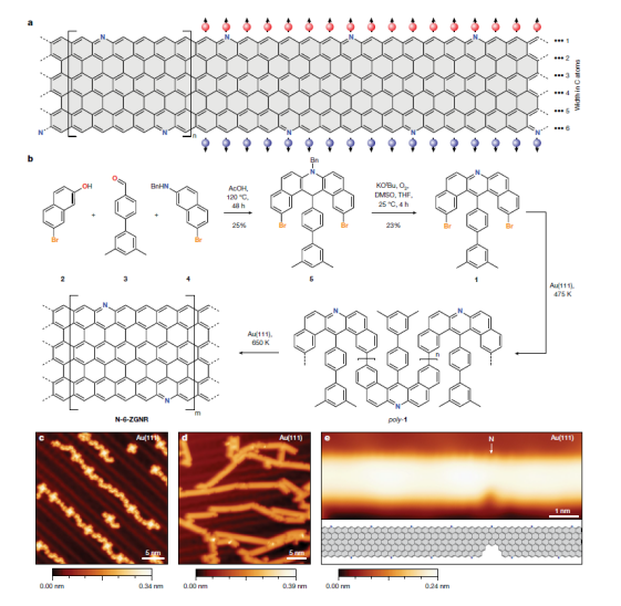以氫為端基的鋸齒形納米石墨烯的自旋有序電子態(tài)產(chǎn)生了磁性量子現(xiàn)象,這引發(fā)了對碳基自旋電子學的新的興趣。鋸齒形石墨烯納米帶(ZGNRs)是由平行鋸齒形邊緣包圍的準一維石墨烯半導體帶,其本征電子邊緣態(tài)沿其邊緣呈鐵磁有序排列,并沿其寬度(1,2,5)呈反鐵磁耦合。盡管最近的進步GNRs具有對稱拓撲保護的自下而上的合成階段,甚至金屬零模式帶,獨特的磁結構邊緣ZGNRs一直從直接觀察了一個強大的雜交的鋸齒形邊緣狀態(tài)與表面狀態(tài)的基礎支持。在本文中,我們提出了一種通用的技術,通過在ZGNR邊緣引入一個取代n原子摻雜的超晶格,來實現(xiàn)熱穩(wěn)定和電子解耦高反應性的自旋極化邊緣態(tài)。第一性原理GW計算和掃描隧穿光譜揭示了由鐵磁有序邊緣態(tài)引起的交換場(~850特斯拉)對低氮單對平帶的巨大自旋分裂。我們的發(fā)現(xiàn)直接證實了ZGNRs.中預測的出現(xiàn)磁序的性質(zhì),并為其探索和功能集成到納米級傳感和邏輯器件提供了一個強大的平臺。