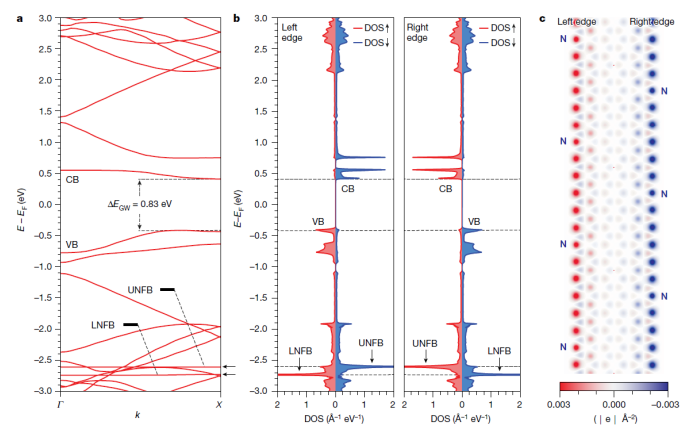 圖4。a、獨立N-6-ZGNR的GW波段結構。b,上(紅)和下(藍)自旋的GW LDOS積分在N-6-ZGNR的左半部分和右半部分上(紅)和下(藍)的GW LDOS積分. c,上自旋和下自旋占據(jù)態(tài)的面積自旋密度分布差的空間分布(ρ (r) ρ (r))。