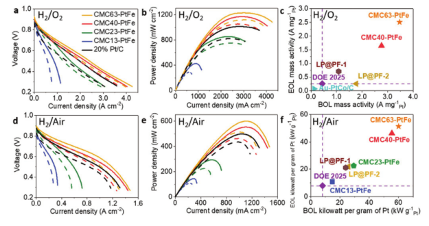Figure 3. CMC-PtFe 用作陰極時,單電池性能評估。a,d) 單電池的極化曲線和b,e)功率密度曲線。c)比較了BOL/EOL質量活性。f) 比較了BOL/EOL每克Pt的功率。