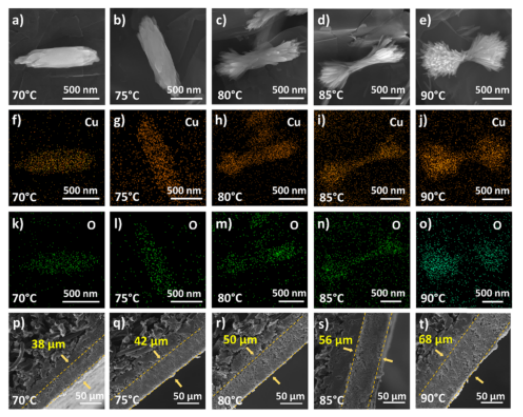 Figure 2. a-e) CG1-5 催化劑上Cu2O納米顆粒的 SEM 圖;樣品CG1-5組分的EDS圖;f-j) Cu 和 k-o) O 元素分布p-t)CGs1-5組裝電極的橫截面視圖的催化劑層厚度。