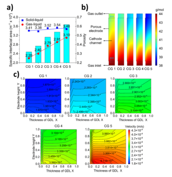 Figure 3. a) CG 催化劑層的比界面面積。b) CG、GDL、CL 在 -1.0 V vs. RHE 時的平均摩爾質量。c) -1.0 V vs. RHE 時GDL 中的平均 CO2 氣體流速。