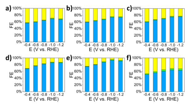 Figure 4. a–e) CGs1–5 和 f) Cu2O在1 M KOH電解液中的法拉第效率曲線,用于 eCO2RR 的產物包括 CO(藍色)、甲酸鹽(綠色)和 H2(黃色)。