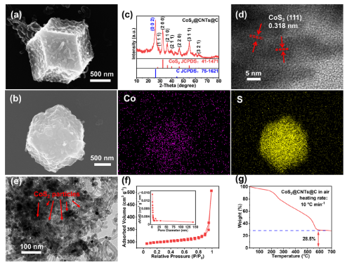 圖2 (a) ZIF-67@CNTs的SEM和(b) SEM和EDS圖像,(c)粉末XRD圖,(d) HRTEM圖,(e) TEM圖,(f)氮氣吸附解吸等溫線和孔徑分布,(g)在氣流為CoS