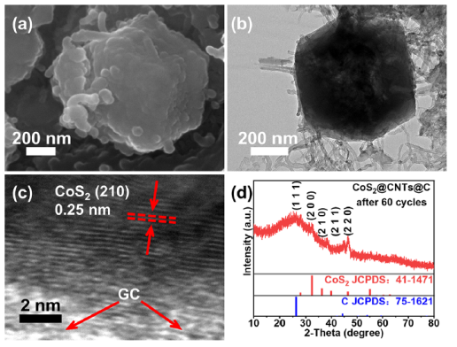 2@CNTs@C經過60次循環后的(a) SEM、(b) TEM和(c) HRTEM圖像(GC =石墨化碳)和(d)粉末XRD圖譜。