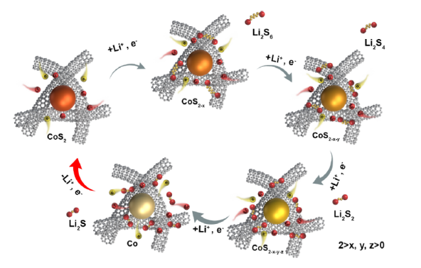 圖 1. CoS2@CNTs@C復合材料局部碳化和硫化示意圖。