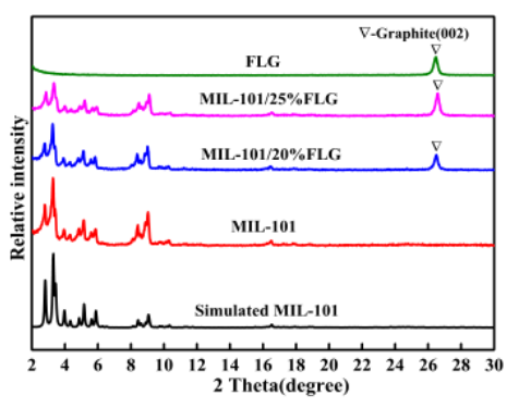 Figure 5. MIL-101、FLG和MIL-101/FLG復合材料的XRD圖譜。